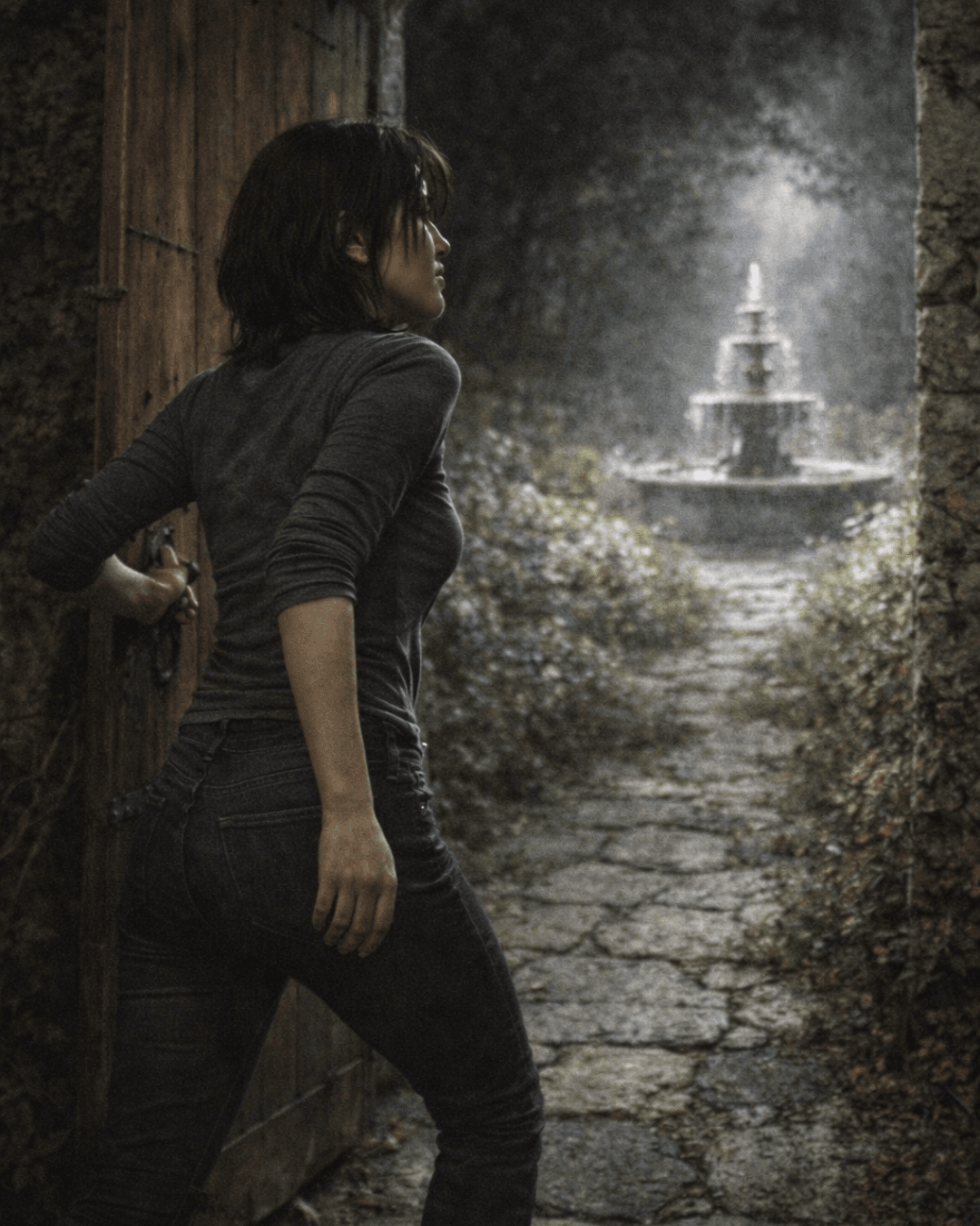 I rest my hand against the old wooden door, feeling the rough grain press into my palm—solid, unmoving. Familiar in a way nothing else in this town has ever managed to be. A strand of my long hair slips loose, catching against my lips in the still air, and I brush it back behind my ear.